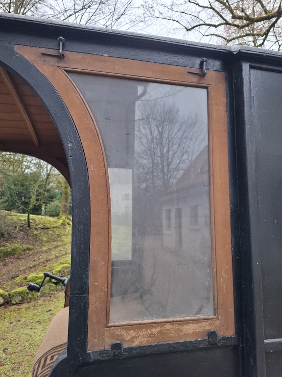 Ledersitze innen und außen, Vorderfenster zum Kutscher zu öffnen, Fenster in den Türen zu öffnen, alle Fenster haben Blickdichte originale Rollos, große Radbremse, Scheibenbremse auf der Hinterachse, Radgummi auf den Rädern und Lederbockdecke für den Kutscher.