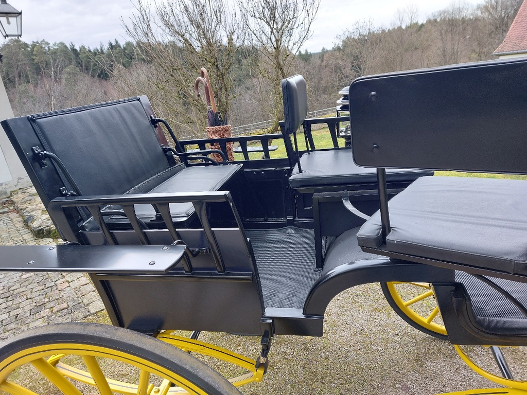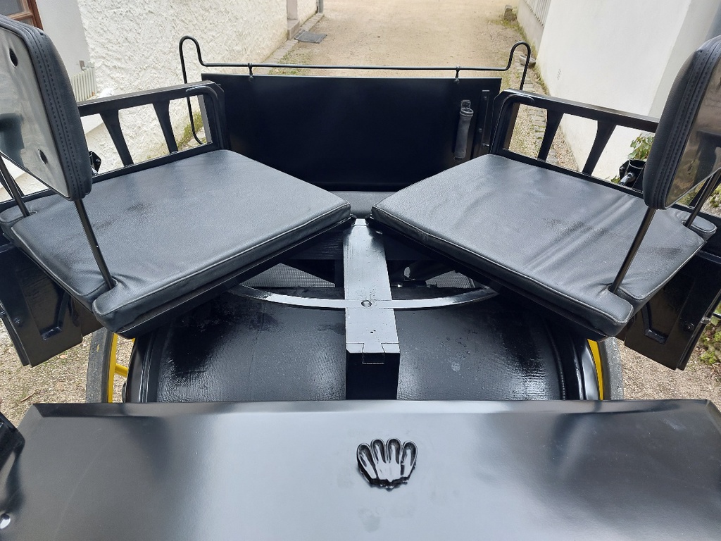 Zweispänner Pony/ Kleinpferde Wagonette (Kühnle) im NEUWERTIGEN Zustand. Umbau von Stahlräder auf neue Holz-Räder mit Gummibelag, neue Lackierung, neue Trommelbremse, neue 2, 3 und 4-spänner Deichsel, neue Ortscheide (eines als Ersatz), Ledersitze, bis zu 6 Plätze, sehr leichter Wagen und bequen für Erwachsene Leute.